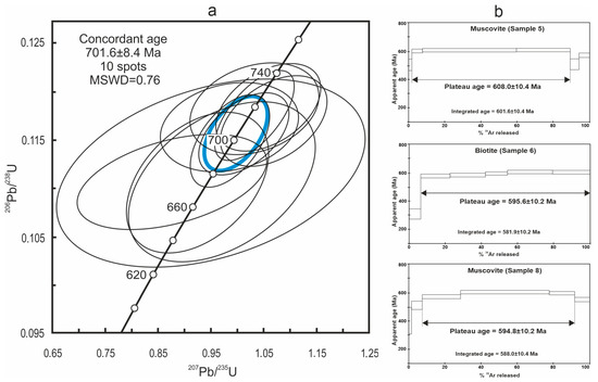 - Likhanov, I.I.; Kozlov, P.S.; Polyansky, O.P.; Popov, N.V.; Reverdatto, V.V.; Travin, A.V.; Verschinin, A.E. Neoproterozoic age of collisional metamorphism in the Transangarian Yenisey Ridge: 40Ar-39Ar evidence. Dokl. Earth Sci. 2007, 413, 234–237. [Google Scholar] [CrossRef]
