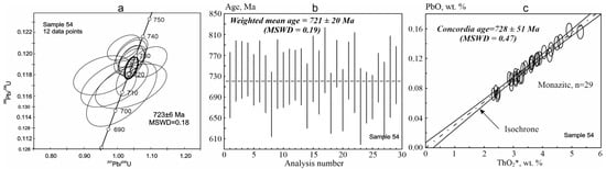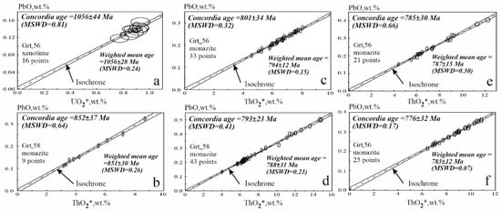 The proposed stages of the metamorphic history of the rocks were dated using the in situ ages of monazite and xenotime inclusions in different generations of garnet (Figure 8). Quantitative analyses of U-Th-rich minerals were performed on a Cameca SX 100 electron microprobe equipped with five WD spectrometers at the Institute of Geology and Geochemistry, Ural Branch, Russian Academy of Sciences. Monazite and xenotime grains were located and characterized in polished thin sections by BSE imaging and energy-dispersive spectroscopy. The elemental mapping was performed by measuring the critical intensities of the X-ray lines across the monazite grains. The operation conditions were 15 kV accelerating voltage and 270 nA beam current for monazite and 200–250 nA for xenotime, and a 2–5 µm spot size. The counting times were 400 s for Th, U, and Pb, and 10–20 s for all other elements on peaks and twice as low at each of the two background positions [85]. The standards used for electron microprobe analysis included ThO2, UO2, Pb2P2O7, synthetic LREE (for monazite) and HREE (for xenotime) phosphates, and diopside. The average detection limits for Th, U, and Pb were 147, 83, and 65 ppm in monazite, and 156, 90, and 40 ppm in xenotime. The analytical errors of the EMP analysis were ΔTh/Th = 0.9% rel., ΔU/U = 1.7% rel., ΔPb/Pb = 3.2% rel. for monazite, and ΔTh/Th = 9.5% rel., ΔU/U = 1.2% rel., and ΔPb/Pb = 1.9% rel. for xenotime (average of 16 spot analyses). Errors in the absolute ages in the range of 11–30 Ma for each run are typically within the error limits obtained worldwide, suggesting a reasonable treatment scheme [86]. Ages were calculated using a modified version of Isoplot 3.66 [85] and following the two alternative approaches: the individual ages calculated from the Th, U, and Pb concentration for individual spot analysis within a single grain [87] and the isochron ages on the ThO2*/PbO (for monazite) and UO2*/PbO (for xenotime) coordinates calculated from the populations of grains [88]. The age error on the ThO2*/PbO diagram was reduced by the inclusion of a plotting element [89] with coordinates equivalent to the absolute error of the Th* and Pb content.