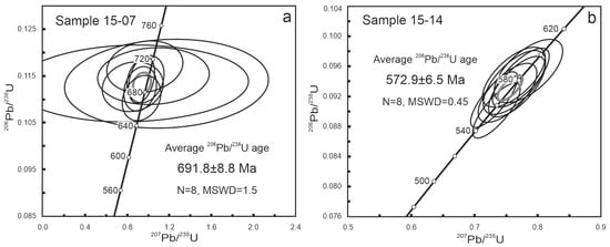 2. Metadacites of the metadacite–andesite–basaltic association are located on the right bank of Yenisey River (Figure 3). Metadacites comprise finely interbedded gray horizons with a massive and schistose structure, which have different mineral compositions. They are composed of microgranoblastic quartz aggregate (60–70%); deformed albite–oligoclase phenocrysts up to 2 mm in size (10–20%); and muscovite, biotite, and chlorite (up to 20%), which emphasize the lens–schistose structure of metavolcanic rocks. Secondary alterations are seen in epidote developed on plagioclase. Accessory minerals are represented by zircon or, rarely, apatite. For our studies, we collected sample 15-07 from massive interbeds of metadacites, which were the least schistose and metamorphosed [10].