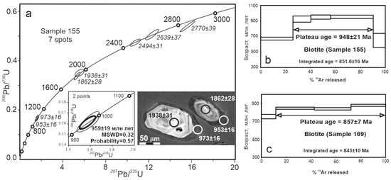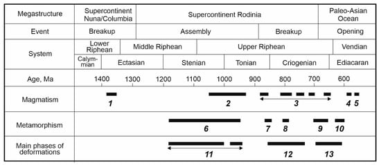 However, there are ideas that the time period of the Earth’s geological evolution between 1.8 and 0.75 Ga ago spanning the middle Proterozoic eon, known in the literature as the boring billion, is characterized by a lesser extent of magmatic and tectonic activity induced by changes in mantle convection and plume activity, which contrasts with the dramatic changes in preceding and succeeding eras [18,19]. On the basis of this assumption, several recent studies suggested the absence of the Mesoproterozoic and, in particular, Grenvillian collisional events within the Yenisey Ridge, and this gave rise to contradictory interpretations of the major tectonic framework of this region.
