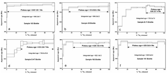 40Ar/39Ar measurements were performed using conventional techniques previously described by [90,91]. The extracted mineral fractions with a size no less than 0.15 mm together with the MCA-11 and LP-6 biotite standards as monitors were wrapped in Al foil and vacuum sealed in fused silica tubes. The samples were irradiated in a VVR-K cadmium-lined research reactor at the Nuclear Physics Research Institute of the Tomsk Polytechnical University (Russia). The neutron flux gradient was no greater than 0.5%. 40Ar/39Ar step heating experiments were performed using a quartz heated by an external furnace. Typical 40Ar blank values of 5 × 10–10 ncm3 were achieved at 1200 °C for 10 min. Released argon was doubly purified by exposure to Ti and ZrAl SAES getters. The argon isotope composition was measured on a Micromass 5400 noble gas mass spectrometer (UK). The apparent ages are quoted at the 1σ (sigma) level, whereas all plateau ages are reported at the 2σ level and do not include the errors on the age of the monitor.
