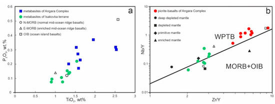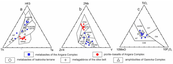 3. The section of the metapicrite–basalt sequence of the Angara region is exposed in the Nizhnyaya River area and downstream of its mouth, and on the left and right banks of the Yenisey River in front of the Belokopytovskie Islands (Figure 1). This section has the following composition (in vol.%): metapicrites 15, metapicrobasalt 48, metabasalt 20%, and carbonate terrigenous rocks 17%. The coastal exposures recover deformed, highly cleavage metamorphosed rocks of the basalt–picrobasalt–picrite composition, which are transformed into tremolite–actinolite, serpentine–actinolite, and chlorite–actinolite schists. This section shows mainly the lower part of the sequence, with most mafic rocks subjected to the greenschist to epidote–amphibolite facies metamorphism [69].