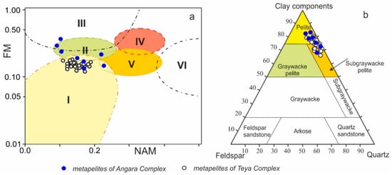- Likhanov, I.I.; Reverdatto, V.V. Precambrian Fe- and Al-rich pelites from the Yenisey Ridge, Siberia: Geochemical signatures for protolith origin and evolution during metamorphism. Int. Geol. Rev. 2008, 50, 597–623. [Google Scholar] [CrossRef]