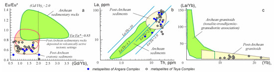 One of the most effective methods for determining the nature and origin of protoliths and tectonic settings is the analysis of rare-earth element (REE) spectra and indicator ratios between other trace elements [24]. Recent advances in understanding the distribution and geochemistry of REEs have primarily contributed to a better understanding of the evolution of igneous and sedimentary rocks. The major, trace, and rare-earth element behavior in rocks is believed by many geologists to be the best indicators for such reconstructions because they are not significantly redistributed during weathering, transport, diagenesis, and metamorphism [25]. As a result, their abundance in altered rocks generally reflects the composition of the source rocks [26]. Thus, metamorphic rocks derived from different provenances preserve a geochemical record of the composition and evolution of the upper continental crust and, consequently, allow us to judge their protolith origin [27].