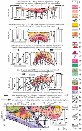 The older metamorphic complexes of Ky-Sil type (Mayakon, Teya, and Chapa areas) were formed due to thrusting rock blocks from the side of the Siberian Craton onto the Yenisey Ridge at ~850 Ma, which is confirmed by geophysical data and study of the nature and age of source areas. The late, repeated collisional metamorphism with an age of ~800 Ma was caused by opposite movements of east-directed small blocks in the subsidiary fault zone of the higher order (Garevka, Yenisey, and Tis areas) owing to the accretion–collisional events of the Valhalla folding [56].
