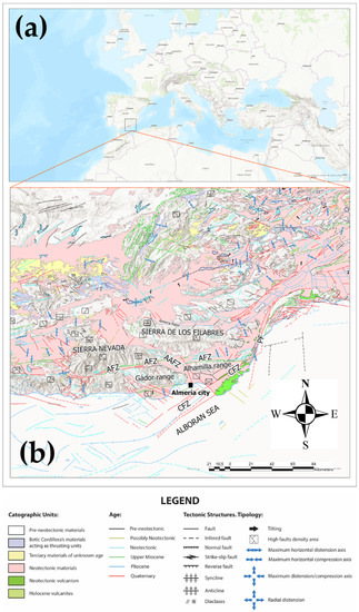 (a) Geographical location of Almeria city; (b) structural map of the southeastern Betic Cordillera (Spain).