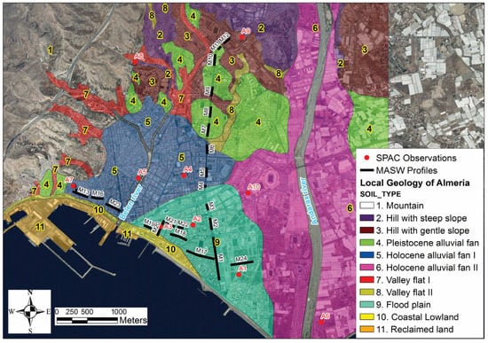 Eleven landform units were identified in the urban area of Almeria city (Figure 2) by combining aerial photography, geological, and geotechnical information [33]. These units range from mountains formed by Pre-Pliocene rocks to coastal lowlands composed of Holocene alluvial deposits (sands, clays, and silts). Two Holocene alluvial fans are the main landforms in this area. One is the Belen river fan and the other is the Andarax river fan.