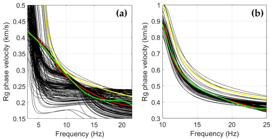 Examples of Rayleigh wave phase velocity dispersion curves at different places (see Figure 2). Experimental dispersion curve (green color), dispersion curve obtained from the initial model (yellow), dispersion curves obtained during the inversion process (black lines), and theoretical dispersion curve for the final model (red line) are shown. (a) A2 site (flood plain); (b) A8 site (hill with a gentle slope).