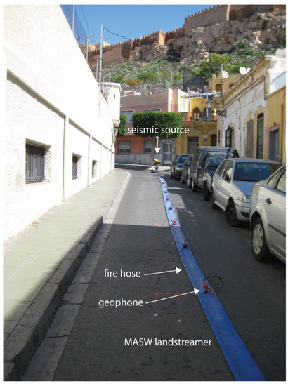 The MASW survey was conducted through the streets of Almeria city, consisting of 7.1 km of linear seismic transects (Figure 2) carried out in active mode using a Wacker Neuson BS60-4s vibratory rammer as the seismic source. A total of 24 geophones (12 of 28 Hz and 12 of 4.5 Hz natural frequency) were interleaved and screwed onto metal plates with 2 m spacing (Figure 4). The offset (distance between the seismic source and the first geophone) was 4 m. The acquisition array, which was 46 m in length, was displaced 10 m between consecutive shots.