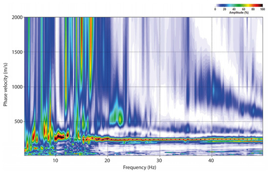 Example of a dispersion curve (white dashed curve) obtained for a shot-gather in Almeria city with MASW.