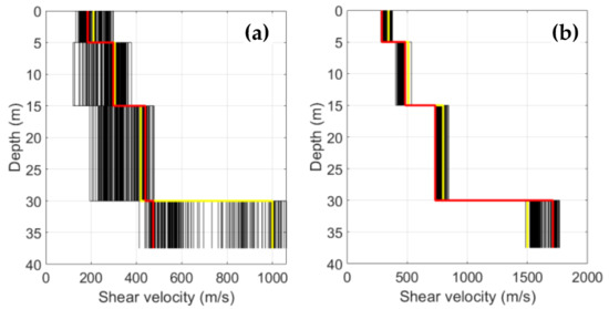 Examples of shear-wave velocity models derived from inversion of phase velocities determined from SPAC measurement at different places (see location in Figure 2). Initial model (yellow line), partial models obtained during the inversion process (black lines), and final model (red line) are shown. (a) A2 site (flood plain); (b) A8 site (hill with gentle slope).