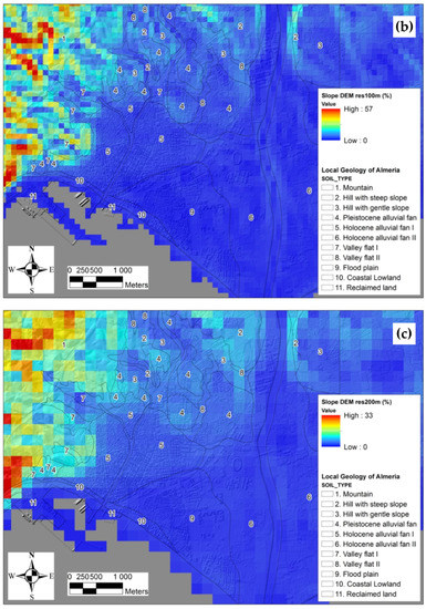 Terrain slopes in Almeria city for a DEM resolution of: (a) 10 m; (b) 100 m; (c) 200 m.