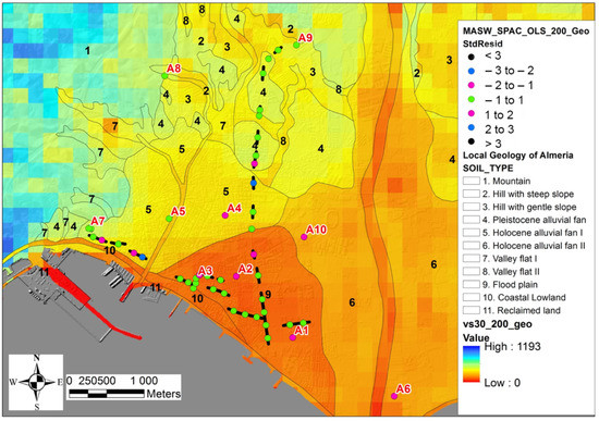 Predicted Vs30 map of Almeria city from the correlation using geological units and slopes (MRS 86.9%) for the sampled area, and the correlation with slope only (MRS 79.1%) for the rest of the municipality. The Vs30 observations (SPAC and average MASW) are represented by dots with a different color according to the standardized residuals between the predicted and the observed values.