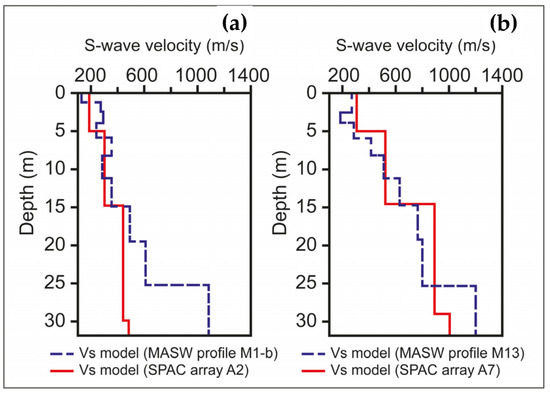 Examples of SPAC and MASW 1D Vs model comparison: (a) MASW profile M1-b vs. SPAC array A2; and (b) MASW profile M13 vs. SPAC array A7. (See locations in Figure 2).