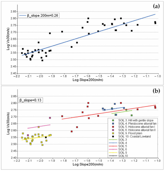The ordinary least squares method was applied, and two possible functional forms: (a) linear relationship between calculated Vs30 and topographic slope (Equation (7)); and (b) linear expression including the dependence on the geological units (Equation (8)).