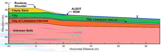 A simplified estimate of site stratigraphy to be used for analysis purposes is shown in Figure 2. The horizontal location of 0 m in Figure 2 is set to the location of the crest of the slope. Topography of the slope is estimated using total station measurements. This site model is developed by comparing the results of the geophysical and geotechnical explorations. More credibility is given to the data in borings B2 and B3 due to uncertainty in the resistivity profile at horizontal distances less than 5 m from the start of the line. A clayey sand layer is included near the surface which becomes thicker near the roadway shoulder. A clay layer is located beneath this sand layer which is about 2.5 m thick and represents soil within the suspected failure mass. The resistivity of this clay layer is lower than the surrounding soils which is consistent with resistivity results for landslides reported by Perrone et al. []. The top of the clay layer is interpreted from borings B2 and B3. Relatively low shear wave velocities are also reported in this clay layer. A thin limestone layer is located about 2.7 m below the top of the clay surface which is consistent with the location of the limestone layer encountered near B6 and the depth of the interbedded clay and limestone from the other borings. A significant increase in shear wave velocity is also observed near the expected location of the limestone interval, and the presence of limestone is expected to increase the resistivity and shear wave velocity.