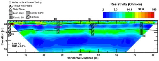 The results shown in Figure 5 are for the downslope resistivity line (R4). The resistivity line is placed between borings B2 and B6 and borings B3 and B7. The results are therefore compared to each respective set of borings and compare well with the results of Figure 4. The resistivity of the upper meter of soil is significantly higher in line R4 than R2, which is attributed to the ground being damp from recent rain during the survey of R2 and dry after over a week without rain during R4. A high-resistivity layer (>50 ohm-m) is shown near the surface. This high-resistivity layer is about 1 m thick near borings B6 and B7 and becomes thicker near the roadway shoulder. A low-resistivity layer (2 to 10 ohm-m) exists beneath the clayey sand layer and is about 2.5 m thick. This low-resistivity layer generally corresponds to fat clay from the borings B3, B6, and B7. A zone of alternating low and high resistivity can be seen in Figure 5 at horizontal distances of 2.5 m to 5 m and elevations of 82 m to 85 m. This alternating pattern of resistivity values may be due to numerical artifacts associated with the inversion attempting to fit the measured data in that area. It is also possible that preferential infiltration along cracks and shear zones allows moisture to concentrate in the lower-resistivity zones observed in this location. Either way, the results in this area should be interpreted with caution. A layer of intermediate resistivity (10 to 25 ohm-m) exists beneath the low-resistivity layer. A thin limestone layer is also encountered at a depth corresponding to the top of the intermediate-resistivity layer near boring B6, and limestone intervals are also reported in this region in the other borings. The lower LL values observed at these depths suggest these soils may have lower clay contents or lower water contents resulting in higher resistivity (e.g., []). The presence of limestone observed in this region may also contribute to an increase in resistivity.