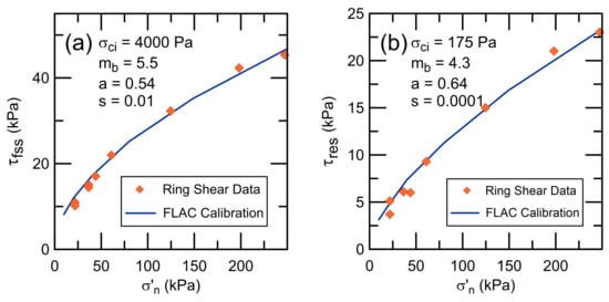 SRM analyses are performed using FLAC V8.0 which does not include a power curve option for representing the nonlinear strength envelopes observed in the ring shear data. The modified Hoek–Brown (MHB) constitutive model is therefore used to represent drained strengths in SRM analyses due to its ability to represent nonlinear shear strength behavior []. Calibration of the MHB parameters to fully softened and residual drained strength is performed using a single element consolidated drained triaxial (CDTX) driver in FLAC. The MHB parameters σci, mb, a, and s are iteratively adjusted to fit the ring shear data at σ′n values up to 250 kPa. While these parameters have physical meaning for rock testing, they are simply used as calibration parameters when applying the model to soil. Results from the model calibration are compared to the ring shear results in Figure 6.