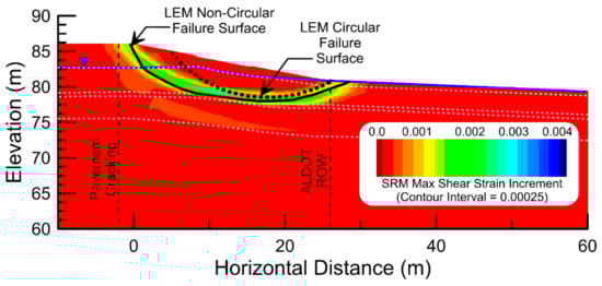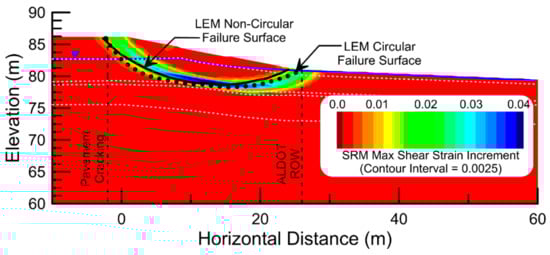 The FS from the SRM is shown in Table 3, and shear strain contours from the SRM results are shown in Figure 7. SRM does not provide a single failure surface, but the area of highest shear strain generally corresponds to the slide plane. SRM is not constrained by the location and shape of the failure surface or assumptions regarding the inclination of interslice forces []. The failure surfaces from the LEM analyses closely match the areas of greatest shear strain from the SRM giving additional confidence in the use of the MHB model to represent the strength of this clay, while the factor of safety is slightly lower than the LEM results. This agreement demonstrates the accuracy of the SRM using MHB parameters to represent nonlinear strength envelopes of clays.