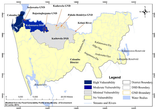 Kolonnawa DSD has a high population density of 7183 persons per km2, whereas that of Colombo district is 3489 persons per km2 [36]. About 70% of the Kolonnawa DSD area is below sea level [37]. In 2016, the worst flood in 25 years hit this area and affected about 155,062 people or 81% of this DSD population [27].