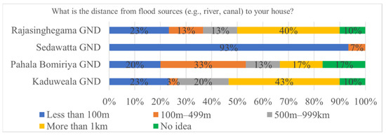 Past studies showed that proximity to a river, canal, or water body is one of the important factors to determine flood vulnerability [10,11,14,50]. Moreover, some studies highlighted that proximity to flood sources will increase behavioral intentions of the affected communities by taking mitigation and preparedness measures [23,51]. Considering these findings, we asked the respondents how far their residences were from water bodies (Figure 2). All the respondents of Sedawatta were within less than 500 m, and 93% of them lived within less than 100 m from the Kelani River. When the 2016 flood affected the Colombo region, the entire community was adversely affected [27]. In the other three communities, 20% to 23% of the respondents lived within 100 m from the River. In Kaduwela and Rajasinghegama, 43 and 40% of the respondents lived within 1 km from flood sources.