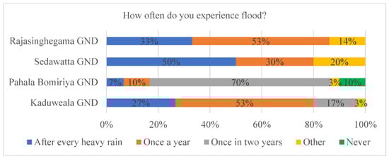 As flood frequency is one of the indicators to measure risk [11,14], we asked the respondents how often they had experienced floods (Figure 3). In response, about 50% of the Sedawatta respondents said that they experienced floods after every heavy rain. The same answer was obtained from 33% of the Rajasinghegama respondents, 27% of the Kaduwela respondents, and 7% of the Pahala Bomiriya respondents. The percentage of those who experienced floods every year reached 53% in Rajasinghegama and Kaduwela. In Pahala Bomiriya, about 70% of the respondents experienced floods once in two years.