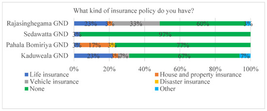 In the next question, we asked if the respondents had insurance to deal with disasters (Figure 4). The Warsaw International Mechanism for Loss and Damage identified insurance as one of the effective risk transfer mechanisms [52]. The result showed that, in Sedawatta, 97% did not have insurance. However, we found that 23% in both Kaduwela and Rajasinghegama had life insurance. Only 17% of the Pahala Bomiriya respondents had house and property insurance. Except for 3% of the Pahala Bomiriya respondents, none of the respondents had disaster insurance. In Sri Lanka, disaster insurance is not mandatory for the residents. Natural disaster insurance coverage is offered as an extension to fire and lightning insurance policies in Sri Lanka [53].