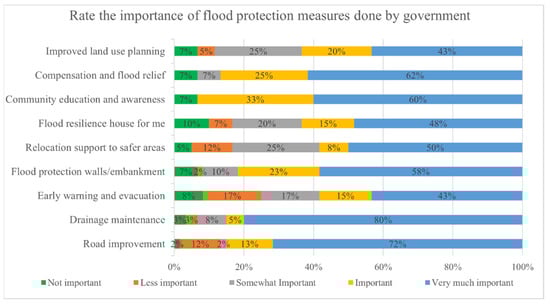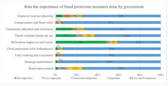 Then, we asked the respondents to rate the importance of current government flood protection measures. Here, we focused on both structural and non-structural flood protection measures. These measures are vital for community disaster risk reduction [43,56]. For this, we used a five-point Likert scale (1 = Not important; 5 = Very much important). The Kaduwela respondents regarded drainage maintenance (80%) and road improvement (73%) as very much important (Figure 5). They chose the following options as important and very much important: community education and awareness (93%), compensation and flood relief (87%), and flood protection walls/embankment (81%). Some respondents found the following options not important or less important: land use planning (12%), road improvement (14%), flood resilience houses (17%), relocation support for safer areas (17%), and early warning and evacuations (25%).