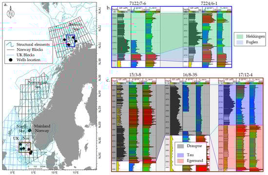 The Norwegian Continental Shelf (NCS) is unique in the amount of data available and comprising three main provinces: the North Sea, the Norwegian Sea, and the Barents Sea. A series of post-Caledonian rift episodes shape the structural configuration of the sedimentary basins in NCS. which are illustrated in Figure 1a [38,39]. The studied areas, i.e., the Barents Sea and the North Sea, share similar depositional and structural setups. Yet, there are substantial differences, mainly in the Cretaceous–Cenozoic burial history and exhumation [35,40,41]. All the provinces in NCS are dominated by NW–SE-oriented rifting, followed by rapid subsidence, siliciclastic deposition, infill, and the draping of rift topography in the Early Cretaceous. However, in the Late Cretaceous, regional transgression and deposition of thick carbonate sequence characterized the North Sea, while time-equivalent marine deposits are highly condensed because of uplift, erosion, and non-deposition within the Barents Shelf deposits. Rock properties are affected by Cenozoic uplift and erosion in the entire NCS region; however, the Barents Sea area has experienced multiple episodes and maximum net erosion, estimated to be around 1–1.2 km in the Goliat Field area and approximately 2 km in the Hoop area [35,41,42,43]. Net uplift in the central North Sea is estimated to be from zero to 0.7 km, while 0 to 1.3 km uplift is assessed in the northern North Sea area [44,45,46].