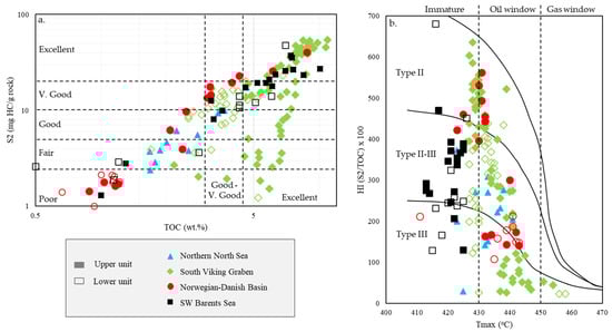 Organic matter fractions and types significantly influence the paleo-depositional setup and played vital roles in caprock properties. Maturation history also considerably changes the geomechanical properties of caprocks; therefore, geochemical reports consisting of total organic carbon (TOC) data were scouted from the public domain database [48]. The studied wells in each sub-basin were selected based on the available rock-eval analysis, where the wells with petrophysical analysis were given priority. Overall, TOC quality ranged from poor to excellent within the NCS (Figure 2a). The South Viking Graben and SW Barents Sea have higher TOC weight percentages than the northern North Sea, while the data from the Norwegian–Danish basin are distributed within a broader range. There is no overall separation between upper and lower units; however, compared within the basin, lower units showed comparatively low values when compared to the upper units. Overall, TOC ranges between Type II to Type III and is within the oil window maturation zone, except for SW Barents Sea data points, for which the values fall to within the immature temperature zone (Figure 2b).