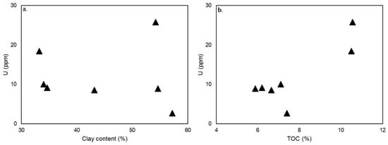 In addition to TOC, there is an indirect relation between uranium proportion and the depositional environment of marine shale, which leads to different mineralogical variations [63,64]. Uranium content in spectral gamma-rays was analyzed to identify the possible depositional variation within the studied wells. The average uranium content in wells 15/3-8 and 17/12-4 was compared with the XRD clay and TOC percentages that are illustrated in Figure 3. A moderate positive correlation of average uranium content was observed with TOC, while clay content data were sparsely distributed. Uranium enrichment indicated a possible distal environment with an anoxic condition that preserved organic matter; hence, robust relations are expected. On the contrary, clay minerals can deposit in a wide range of environments (i.e., floodplains, lakes, shorefaces, prodelta areas, abyssal plains, etc.); therefore, no direct relation might exist.