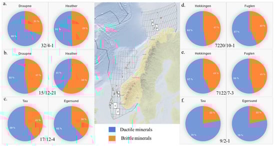 The ductile (i.e., clay and TOC) and brittle (i.e., quartz, feldspar, carbonate and pyrite) mineral percentages of Upper Jurassic caprock in different sub-basins in Norwegian Continental Shelf: (a) Draupne and Heather formations from the northern North Sea, (b) Draupne and Heather formations from South Vikings Graben, (c,f) Tau and Egersund formations from Norwegian–Danish Basin, and (d,e) Hekkingen and Fuglen formations from SW Barents Sea. The map in the middle represents the block location of the wells studied here.