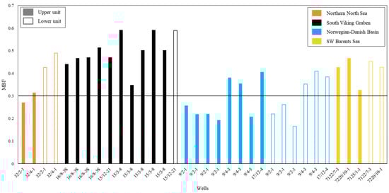 The variation of mineral assemblages is also demonstrated in mineral-based brittleness indices (MBI), where the South Viking Graben represents the highest BI values (Figure 5). The MBI value is divided into two halves (cut-off at 0.3) to assess the qualitative comparison between different sub-basins. Based on this division, the Norwegian–Danish Basin and the upper unit of the northern North Sea show more ductile caprock shales compared with the rest of the wells. Moreover, the data from the SW Barents Sea and lower units from the northern North Sea basins show higher MBI values. Conversely, considering the total range (i.e., zero is equivalent to ductile and one is equal to brittle), most of the wells are in between ductile and less brittle zones (equivalent to <0.5). However, it is worth remembering that the mineralogical brittleness does not consider many parameters (i.e., grain orientation, grain size, degree of cementation, effective stresses, temperature, etc.) that influence the brittle behavior of the caprock shale during failure.