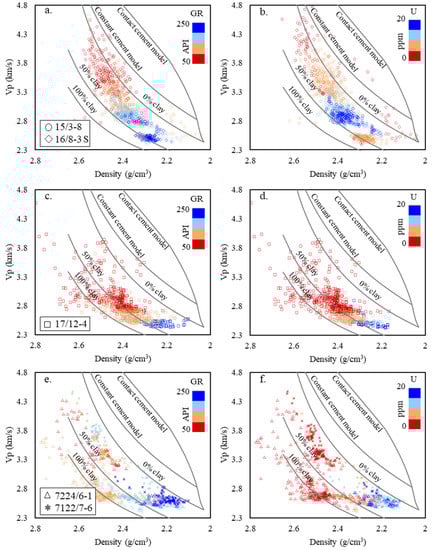 Elastic properties significantly vary due to depositional environment variation and post-depositional changes (i.e., diagenesis processes). Gamma-rays (GR) were used as a proxy for paleo-depositional variation, while the spectral uranium (U) content log represents the anoxic environment, which is also indicative of the presence of higher organic contents (Figure 3). The studied wells from different sub-basins show variation between gamma-ray values as well as diagenetic trends (Figure 6). The Draupne Formation in well 15/3-8 shows increasing trends of compositional properties with decreasing gamma-ray values, which follows the trends explained by Hansen et al. [36]. However, the low velocity and density data points from the well 16/8-3 S indicate low uranium content, though few data points from the same well show high GR and U values and follow the TOC trend [35]. High GR and U data points from the well 17/12-4 have a low density and Vp; however, instead of following the compositional trend with decreasing GR, the data point followed a different trend, where density increased faster than Vp (Figure 6c,d). The well 7224/6-1 also shows a very different trend with decreasing GR values. Density increased with decreasing GR and U up to a certain point, while Vp remained constant; then, a significant increase in Vp was observed with very gentle changes in density (Figure 6e,f). On the contrary, the other well from the same area followed a compositional trend with data points clustered into two zones based on the mineral compositions.