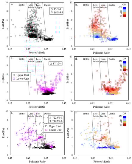 Wells from the South Viking Graben are presented in Figure 7a,b. Lower velocity and density in well 16/8-3 S (Figure 6a) represent less stiffness with very low Es and high ν. Changes in GR change the stiffness of the caprock. On the contrary, the well 15/3-8 shows a significant increase in stiffness with variation in gamma-ray (Figure 7a,b). According to the background curves, the well 16/8-3 S data points fall within the ductile to less-ductile zone, while 15/3-8 is mainly within the less-ductile to less-brittle region.
