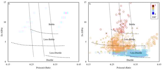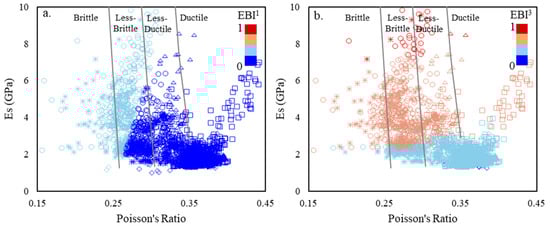 Es versus ν cross-plots of the Upper Jurassic caprock from the North Sea and the Barents Sea color-coded with: (a) EBI1 and (b) EBI3. The BI boundaries are adapted from Perez and Marfurt [67].