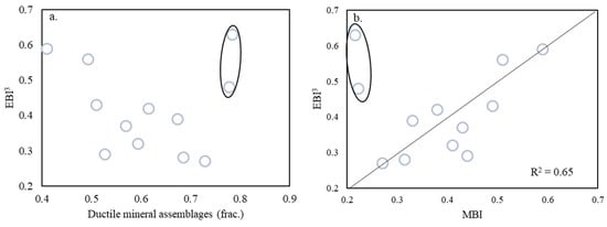 Correlation between the elastic properties-based brittleness indices (EBI3) versus ductile mineral assemblages (a) and mineralogy-based brittleness indices (b). A strong correlation is observed between elastic properties and mineralogy within the studied wells.