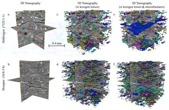 3D tomographical images at 0.7 μm/voxel from both the Draupne (16/8-3 S) and Hekkingen Formations (7125/1-1). (a,b) Grayscale orthoslices highlighting fractures and kerogen lenses in black, (c,d) with 3D realization of just kerogen lenses, and (e,f) 3D realizations of kerogen lenses and branching microfractures.