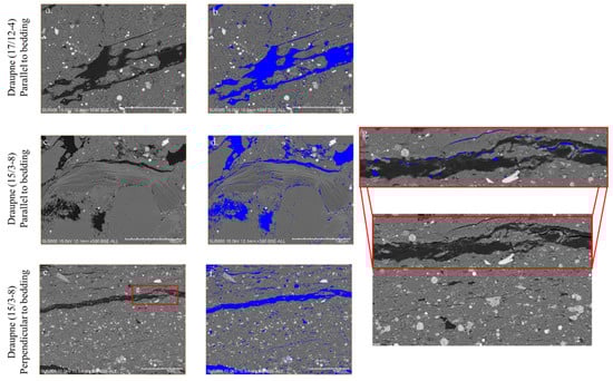 Microfracture networks influence caprock properties, the impact of which is observable utilizing EBI [41]. Bedding parallel and normal fractures were observed in SEM images of the Draupne Formation when sufficiently mature (Figure 11a–f). Some of the bedding normal fractures were generated due to organic carbon maturation, as seen through the association with the layer of organic carbon observed. Moreover, deep resistivity and TOC data from this well confirmed the TOC abundance and maturation (Figure 7). On the contrary, fracturing parallel to the bedding is associated with secondary carbonate and the clay mineral layer. The TOC layering is not involved, which suggests this fracturing occurred due to the diagenesis processes and clay mineral alteration.