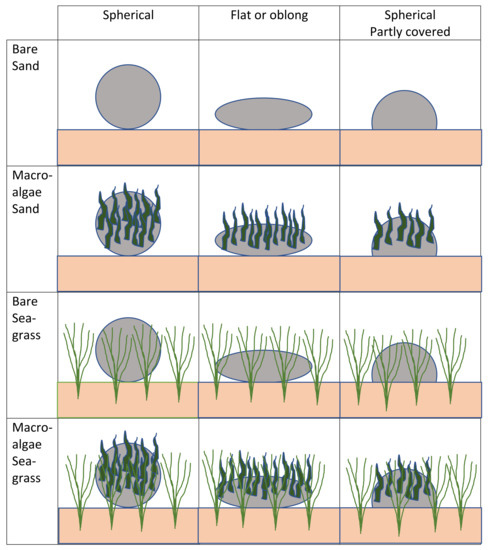 Spherical, boulders, covered by macroalgae on bare sand can be detected from all four groups of boulder characteristics, but even very small patches of vegetation or macroalgae growing on cobbles can affect the colour contrast signal. It is difficult to detect boulders in vegetated areas, especially if they are non-spherical.