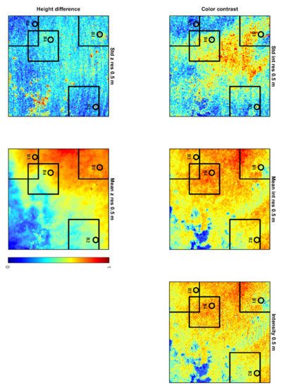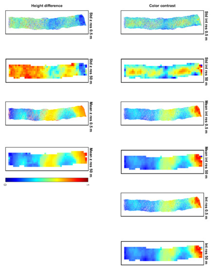 A grid with 0.5 m resolution, due to the 0.4 m footprint, has been created for each feature in Figure 6.