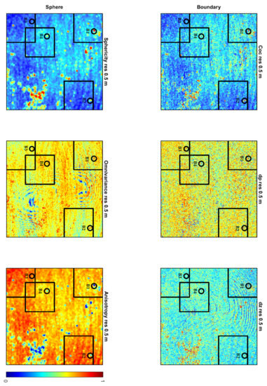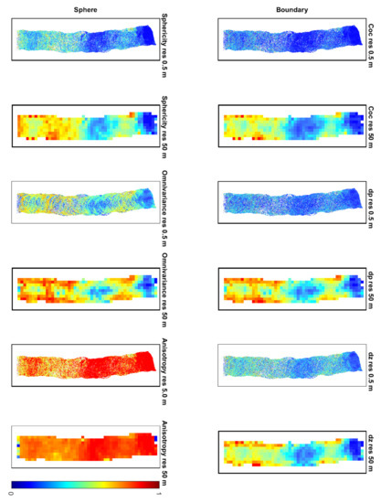 The covariance features were calculated as in [4], but for all six neighbourhoods in the sensitivity analysis. All features outlined above were calculated for each point in each 30 m × 30 m point cloud and for all the six analysed radii in order to find out which features, and which radii, are best for displaying a boulder site.