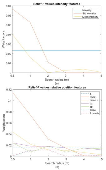 The Relief-F algorithm calculates a weight for each feature/neighbourhood combination, depending on the importance of the features. Instead of comparing the feature value of a point with the class of the corresponding located point in the classified test set, the comparison is made in a way which is independent of the physical location of the points. Rather than looking at how the feature-values deviate from each of the numbers given by the classification set, feature-values close to each other are used for the comparison. The algorithm determines the value of a feature for a point, and then identifies k other points whose values come closest to this value. It compares with the classification set and examines how many of these other points have the same class (boulder/non-boulder) as the point itself, and how many have a different class (hit and miss values). This procedure was carried out for all points and all features, and the algorithm now assessed how good each feature was at describing whether there was a boulder, using a calculated weight value (see relieff in [11]). If k is set too small, the estimates can be unreliable in case of noisy data, i.e., spurious data not reflecting actual physical conditions. On the other hand, a very large k can result in obscuring important predictors because of the increased probability of agreement between the values. To avoid these extremes, k was chosen as , where X was the number of observations in the data set. A boulder was represented by between 20 and 50 points, while resulted in about 3 to 5 times as many investigated values. This creates a prediction error, because it increases the number of values deviating from the classification set. This error, however, is the same in all the feature evaluations, and will not, therefore, affect their relative ability to detect boulders. This larger value of k also ensures some robustness if an area includes a few boulder-like structures or boulders not recognized in the ground truthing process, where the four single boulders were found. If k were chosen as 10, which is sometimes recommended, a single boulder-like structure not included in the classification set could result in a good predictor being discarded. The algorithm was applied to each of the four single boulder areas (30 m × 30 m) and to the four areas together. The most relevant neighbourhood size was chosen for each feature and a threshold weight was chosen to select the features, which constituted the best boulder predictors. The sixteen features described in Section 3.4 were used for this analysis. The values for intensity and depth were used directly from the LiDAR data output, while the remaining 14 features were calculated for six neighbourhoods (0.5 m, 1 m, 2 m, 3 m, 4 m, 5 m), which led to 86 feature/neighbourhood combinations.