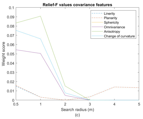 where is the eigenvectors and is the eigenvalues, , , and [4]. The eigenvalues were chosen so that . The geometrical characteristics such as linearity, planarity, and sphericity were determined for each point in the point cloud from the following Equations [4,8,33,34,35,36]: