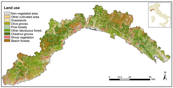 Forest covers more than 70% of the total surface [42], and it is characterized in large part by the association between beech (Fagus) and silver fir (Abeis alba). These two wooded species, typical of the ancient forests of the Ligurian Apennines, are currently associated with Scots pine (Pinus sylvestris) and larch (Larix decidua). In the western and eastern tips of the region, there is a consistent spread of Mediterranean forest with prevalent Aleppo pine (Pinus halepensis) and Maritime pine (Pinus pinaster), often mixed with numerous broad-leaved trees. The natural populations of these two species, in particular for the maritime pine, are very localized, as most of these pine forests are of artificial origin, with ages ranging between 50 and 120 years [43]. In addition, agricultural and grazing activities have progressively been abandoned in recent decades, favoring the occurrence of wildfire events, which can spread rapidly using the highly flammable pines and shrub species.