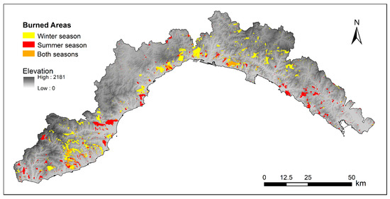 The input dataset used in the present study is the same one used in [15], consisting of mapped burned areas spanning a 21-year period (1997–2017) (Figure 2), provided by the regional forestry service [46]. This wildfire inventory was created based on GPS-surveying and subsequent digitalization over the cadastral map (scale 1:10,000) and includes the starting date of each event. The availability in Liguria of a mapping of fire perimeters (through ground measurements) allows one to carry out a thorough analysis that is not affected by the drawbacks of satellite-based digital observations. The final dataset comprises 8217 wildfires, with an annual mean of 391 fires, burning an area of about 3035 ha per year (Figure 2). To account for the fires’ seasonality, two macro seasons have been considered: winter, from November to April, and summer, from May to October. These two seasons are characterized by a quite distinct spatial distributions of the burned areas (Figure 3) and were therefore analyzed separately.