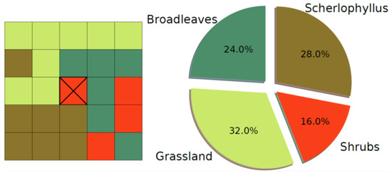 Moreover, all the areas classified as “burned area” were reclassified based on the classes of vegetation that covered these areas before the wildfires, evaluated by expert knowledge and by means of maps dated back to an antecedent period. This allowed us to create an accurate map holding detailed information on the different classes of vegetation, especially as concerns the forest cover types. This information had two functions in the present work: (1) the vegetation map has been used as a categorical variable, to describe the class of vegetation as local information characterizing each single pixel (referred to “local vegetation”); (2) for each pixel, a Moore neighborhood of order 2 (resulting in 24 surrounding pixels) was evaluated (Figure 4), allowing us to estimate the percentage of each class of vegetation or non-flammable area within the neighboring pixels (referred to as “neighboring vegetation”) and resulting in 38 additional numerical predictor variables (Table 1).