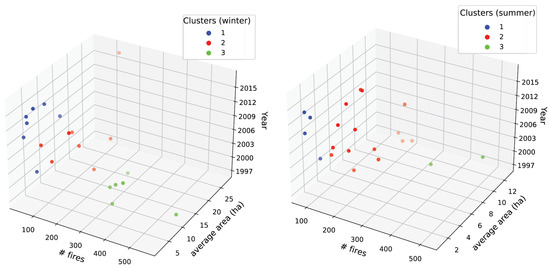To overcome this issue, the testing subset was implemented by selecting, for both winter and summer, a set of years that are fully representative of the possible wildfire trends observed throughout the entire area and study period. This was obtained by splitting the original input wildfire dataset into three different clusters using the K-means algorithm. The idea was to find homogeneous sub-groups with similar characteristics and tendencies within each group, while maximizing the difference among groups. As clustering criteria (i.e., the attributes of similarity among members of the same cluster), we considered the total number of wildfires and the average burned area per year; see Figure 5. Then, for each one of the three clusters, one year was chosen randomly and assigned to the testing subset. As result, the years 2001, 2010, and 2016 were selected for summer, and 2003, 2007, and 2015 for winter to form the testing subsets.