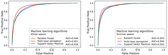 RF resulted to be the best predictive model, both for winter and for summer (Figure 6), as attested by the highest values of AUC (0.944 and 0.953, respectively), followed by MLP (0.921 and 9.940), and lastly, by SVM (0.916 and 0.931). The RMSE estimator confirmed this result; see Table 2. Indeed, RF has the lower values for both the seasons (0.329 in summer and 0.335 in winter) compared to MLP and SVM, which have higher values for summer (0.344 and 0.358, respectively) and winter (0.353 and 0.360, respectively).