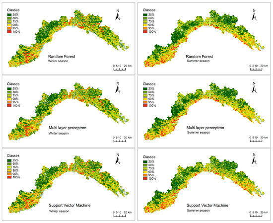 Table 3 shows the percentage of burned area in the testing dataset (Testing BA) within each percentile class range (Classes) and the corresponding probabilistic predicted value (Prob. Value). The same percentile range’s limits can correspond to different values of the probabilistic output, allowing the competent authority the make decisions based on a given threshold for the highly susceptible area rather than on the raw output values. A model that predicts good results is expected to produce a higher percentage of the testing burned area within the highest percentile ranges and a lower percentage in the lowest ranges. Indeed, this is exactly what happened with the three algorithms (RF, MLP, and SVM) for both the seasons. Moreover, looking at the 25% of the area with the highest probability of burning (corresponding to the class >75%), results indicate that RF performs better that SVM and MLP: 93.65% of the test set’s burned area was predicted for winter and 94.80% for summer, compared to 89.57% and 87.30% for winter and 92.68% and 91.93% for summer for MLP and SVM, respectively. Likewise, given the area with the lowest probability of burning (corresponding to the class 25%), the three algorithms allocated a very low extent of test burned area for winter (0.27%, 0.48%, and 0.42% for RF, MLP, and SVM, respectively) and for summer (0.18%, 0.10%, and 0.34% for RF, MLP, and SVM, respectively).
